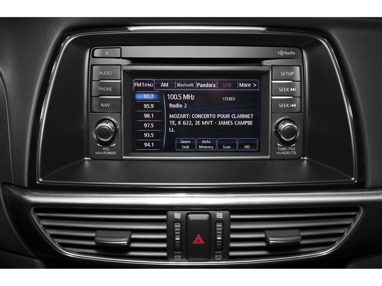 • Radio: AM/FM/CD/MP3/AUX 6-Speaker Audio & HD Radio -inc: 4-full range door speakers and 2-tweeters, audio menu voice-command, Bluetooth® hands free phone and audio, E911 automatic emergency notification, 5.8" full-color touch-screen display for audio, phone, rearview camera, Commander Switch for touch-screen display, Pandora internet radio compatibility, Radio Broadcast Data System program information, SMS text message audio delivery and reply and USB audio input
